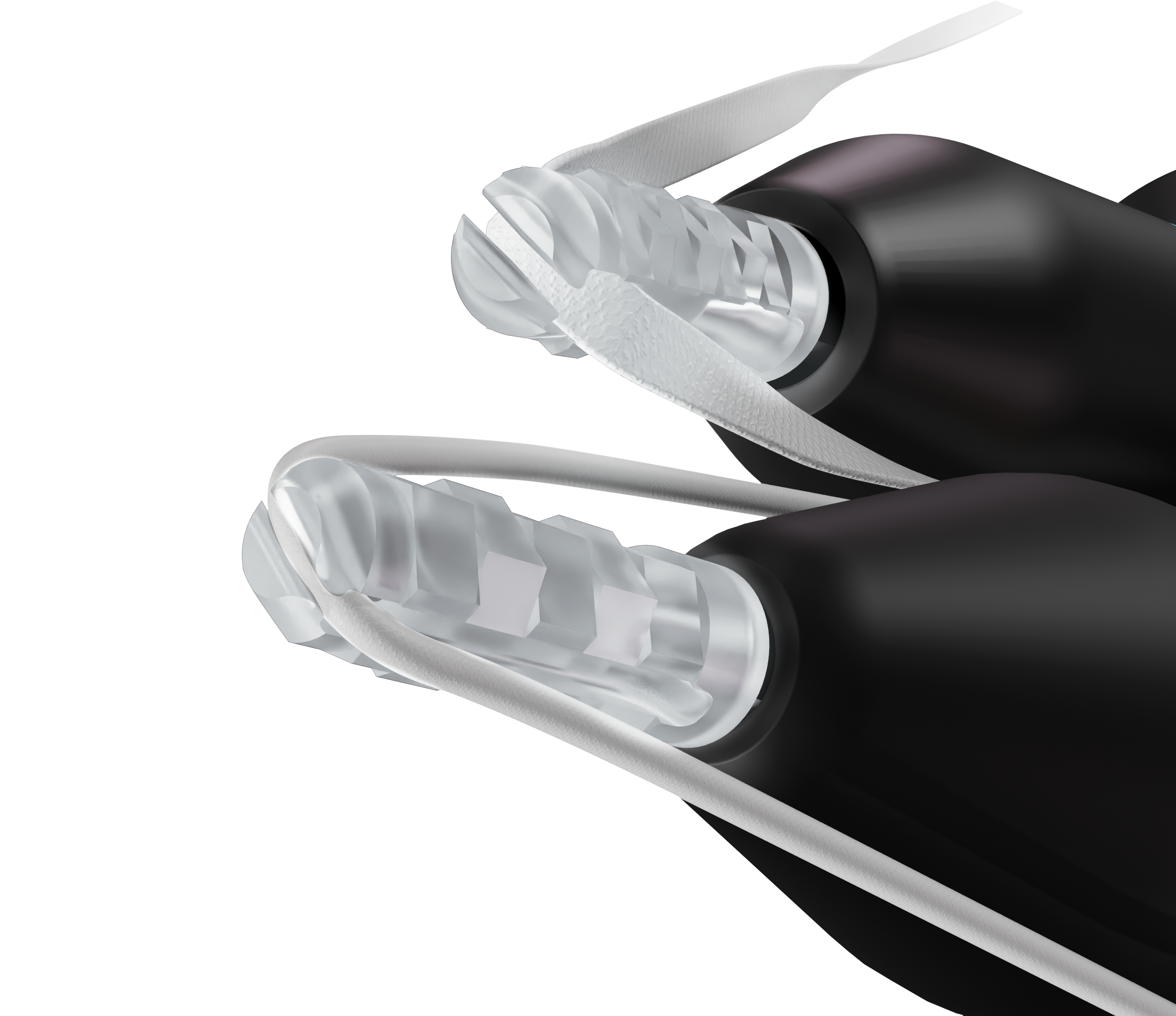 The shaft has two functions: grooves guide and protect the sutures during the implantation process. The ridges concentrate the ultrasonic energy and ensure that the surface of the shaft melts consistently and with the minimum amount of energy.