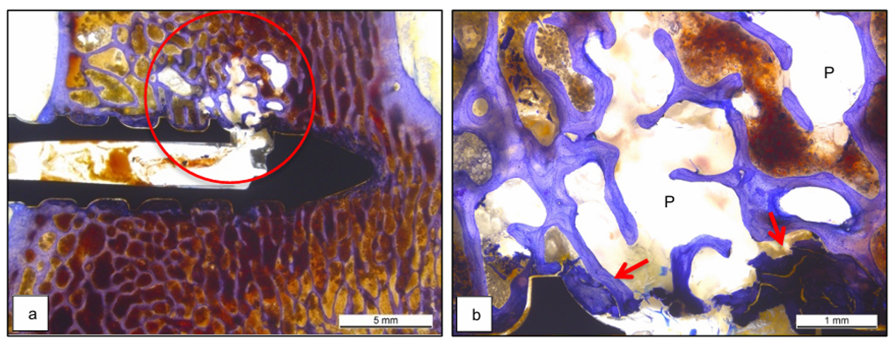 Overview of the extrusion hole and infiltration zone in an augmented titanium screw with absence of isolated trabecular fragments (a). Magnification view of the polymer infiltrating zone (b). Red arrows represent some bone debris due to screw insertion.