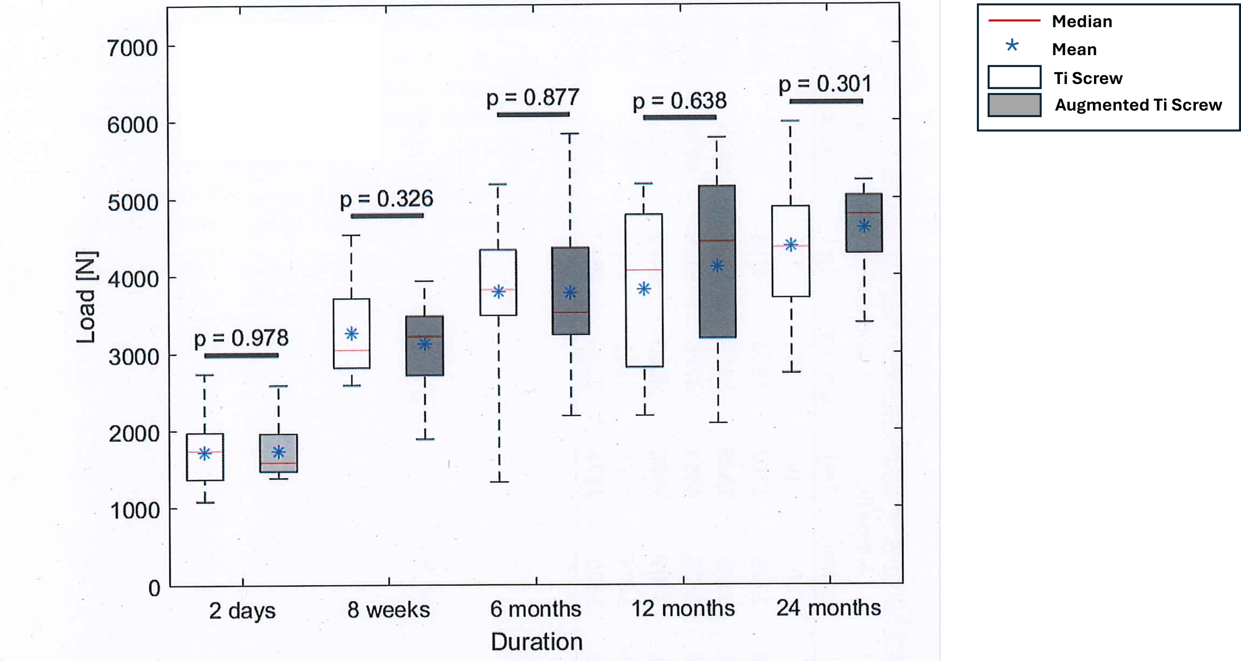 Augmented titanium screw showed overall better pullout load and lower variance as compared to titanium screw, although data were not statistically different.